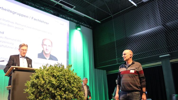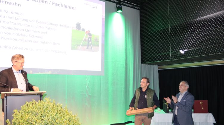 Während dem Nachtessen wurde es feierlich: Eine grosse Zahl gemeldeter Kandidaten und Kandidatinnen aus unserer Sektion – Vorarbeiter, Poliere, Techniker und eine Holzbau Ingenieurin – konnten für bestandene Abschlüsse geehrt werden. Zu den zurücktretenden Mitglieder Matthias Remund, Rechnungsrevisor und Marc Röthlisberger, Vorstandsmitglied gesellte sich Jakob Nessensohn, der für seine langjährige Arbeit in der Grund- und Weiterbildung als Ehrenmitglied gewählt wurde. Etwa ein Drittel der rund 120 anwesenden Sektionsmitglieder war bei Jakob in der Schule.
