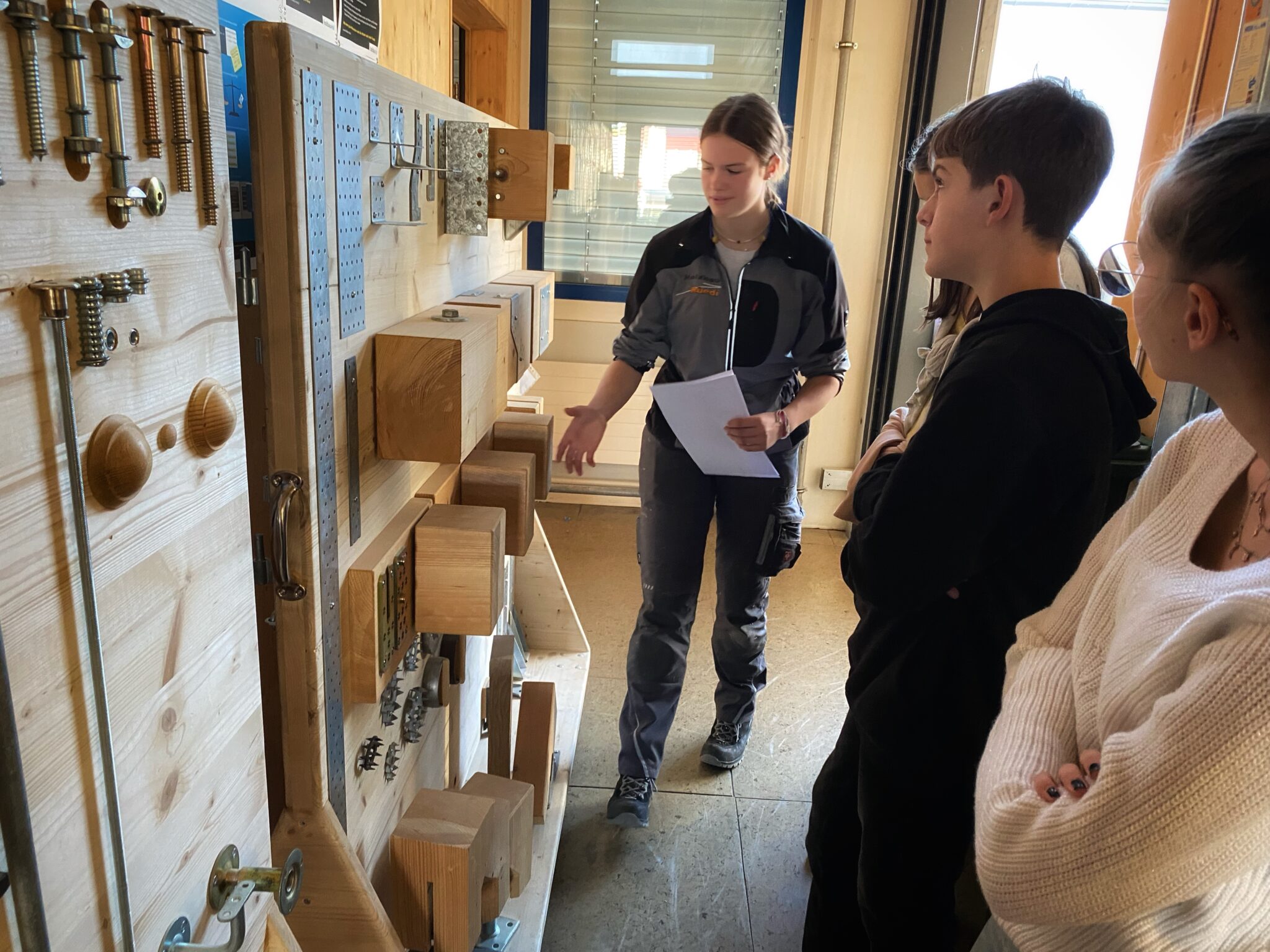 Sandra Kessler (Holzbau Rüedi AG), eine Holzbau-Lernende im ersten Lehrjahr, führte die Jugendlichen mit Begeisterung und Fachwissen durch das Zentrum. Die Schülerinnen und Schüler, die sich in der Phase der Berufsorientierung befinden, bekamen einen Einblick in die vielseitigen Ausbildungsmöglichkeiten im Holzbau – von theoretischen Grundlagen bis hin zu praktischen Fertigkeiten. Sandra, deren Vater ebenfalls Zimmermann ist, teilte ihre Leidenschaft für das Handwerk und das Material Holz. Sie betonte die Wichtigkeit der Arbeitssicherheit und erklärte, dass trotz der Vielfalt an Maschinen die handwerklichen Fähigkeiten und das Wissen um Sicherheitsmassnahmen im Holzbau unerlässlich sind.