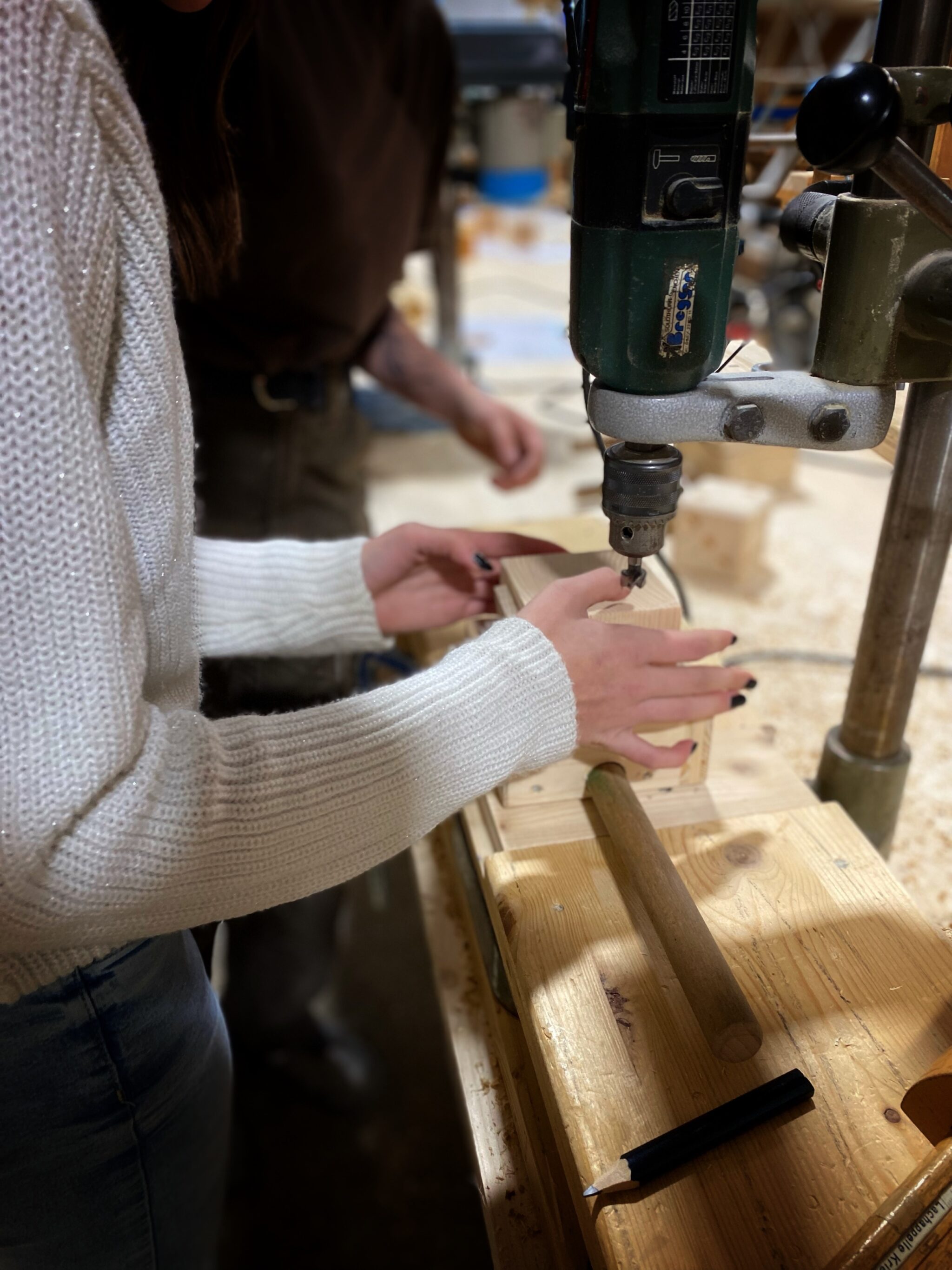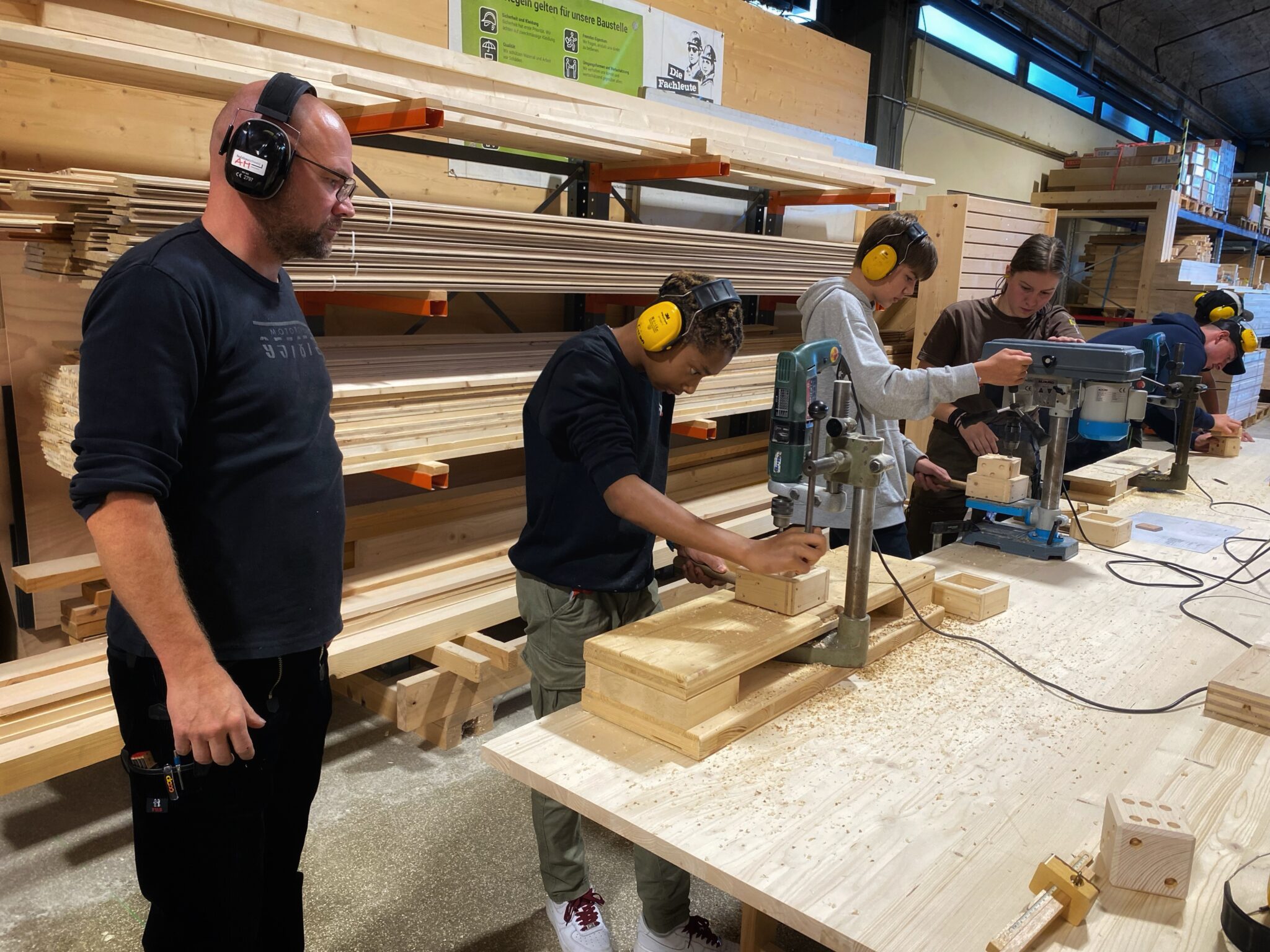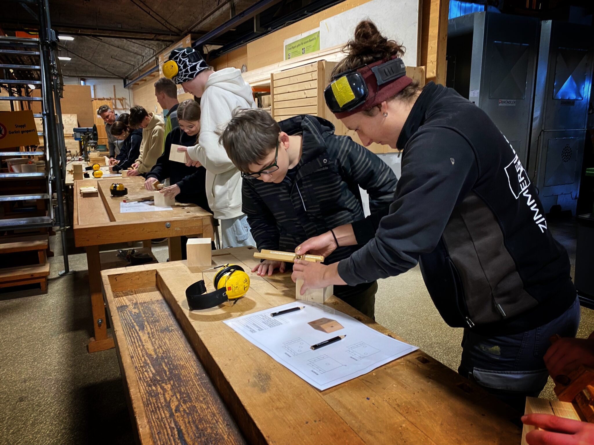 Zusammen mit Jana Ösch (Mosimann Holzbau AG) und Tim Kramer (H. Stebler AG) hatten die Jugendlichen die Gelegenheit, selbst mit dem Material Holz zu arbeiten. Nach dem Anzeichnen des Holzes erstellten sie unter fachkundiger Anleitung, an der Tischkreissäge, Abrichthobelmaschine, Langloch- und Ständerbohrmaschine einen Ständer für Stifte in Form eines Holzwürfels.