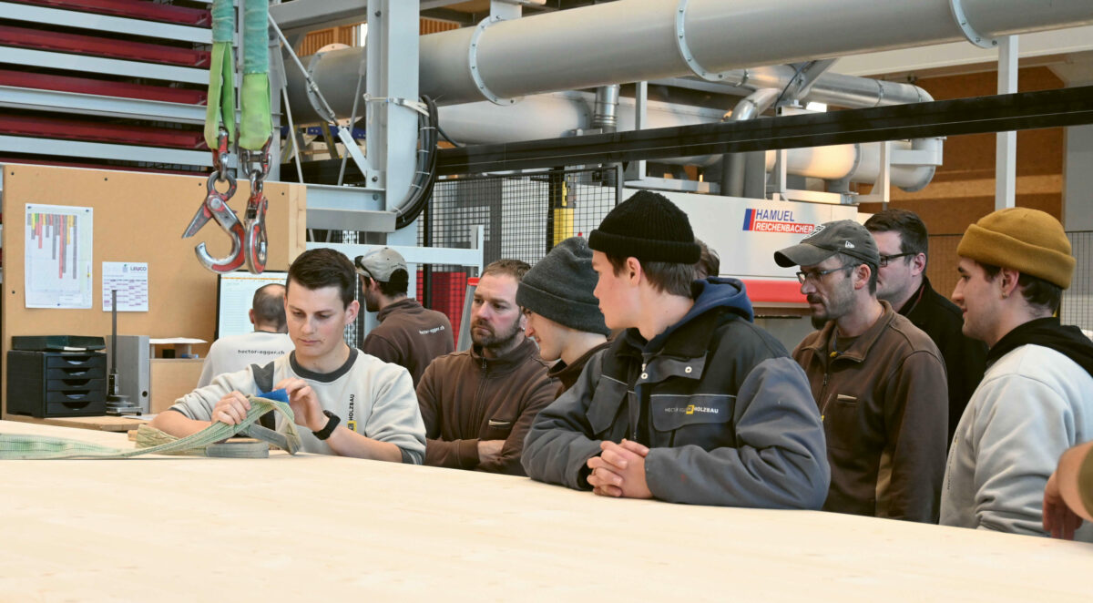 Um den zunächst durchgeführten Theorieteil einfach und gut abzudecken, griff der Sicherheitsbeauftragte Thomas Rosenberger von der Hector Egger Holzbau AG auf die Präsentation von Holzbau Vital zurück. Die Mitarbeitenden erhielten im firmeneigenen Seminarraum zudem das Suva-Faltblatt «Zehn Regeln für das Anschlagen von Lasten». Auf den Websites von Holzbau Vital und der Suva steht dieses zum Download bereit. Folgende Punkte wurden besprochen: