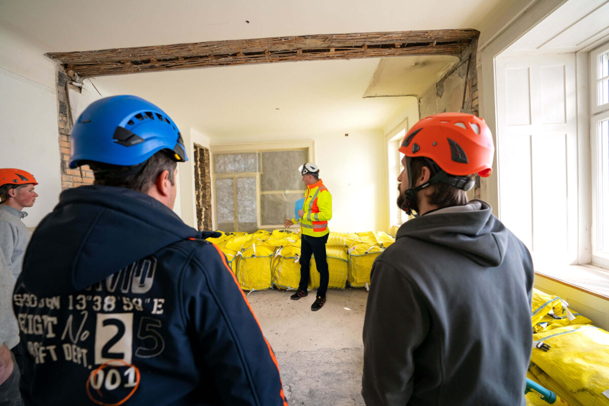 Auf einer Baustelle der Artho Holz- und Elementbau AG erklärt Jürg Leuenberger (M.) von der SpanSet AG die Funktionsweise der Sturzkissen.