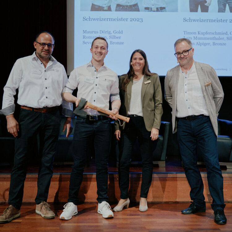 Ein emotionaler Höhepunkt war die Ehrung des Nationalteams Holzbau mit dem amtierenden Weltmeister Michael Bieri. Mit dabei war auch der amtierende Schweizermeister Maurus Dörig, der an den EuroSkills in Herning (Dänemark) antreten wird. «Wir sind sehr stolz auf unser Nationalteam», betonte Hansjörg Steiner und verwies auf weitere erfolgreiche Zimmerleute wie den Schwinger Martin Roth oder den Skiweltmeister Franjo von Allmen. Sie alle zeigen eindrücklich, wie viel Leidenschaft, Ehrgeiz und Leistungswille in der Branche steckt.