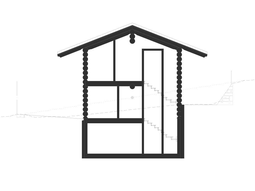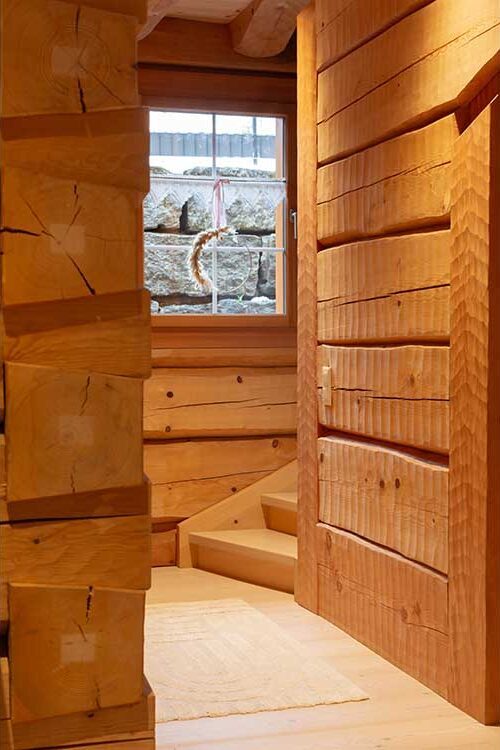 A differenza dei tronchi sovrastanti, lo strato inferiore delle travi è realizzato in abete di Douglas della Valle del Reno sangallese. Con un taglio trapezoidale (l’alburno è stato rimosso) si ottengono come base delle superfici dritte, che talvolta facilitano l’integrazione delle prese di corrente. Al di sopra si erge una parete di tronchi rotondi naturali (abete bianco), che grazie alle giunture cave longitudinali si incastrano perfettamente l’uno sull’altro, risultando stabili e a tenuta d’aria. Per adattare la scanalatura di un tronco alle irregolarità di quello sottostante, la forma del legno inferiore viene rilevata con un cosiddetto compasso da blockbau e trasferita con una matita sul legno superiore. I tronchi della parete interna vengono rifilati su entrambi i lati e successivamente lavorati a mano con l’ascia di taglio.