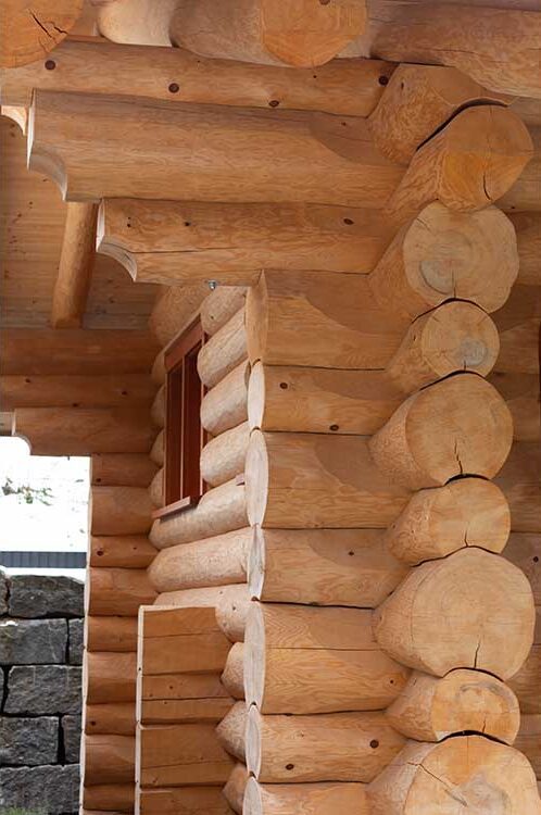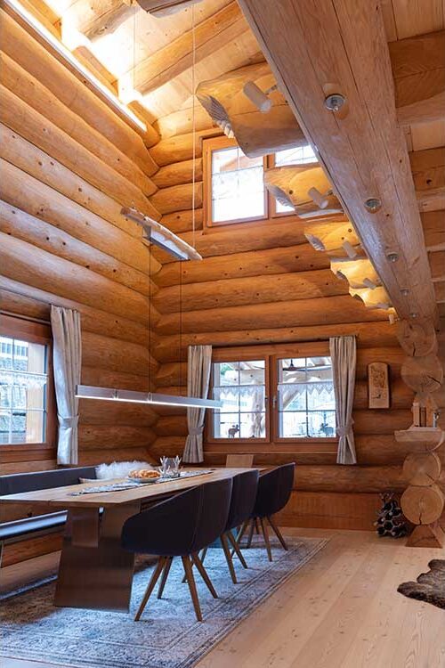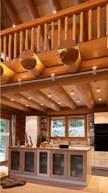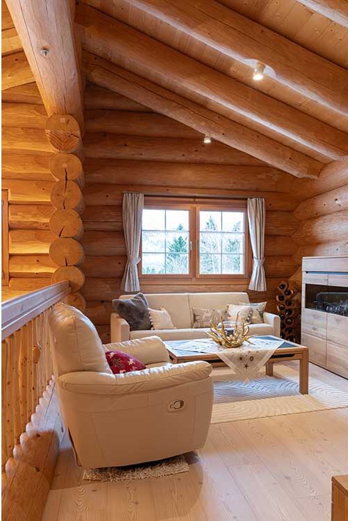 Poiché un tronco può fessurarsi con il passare del tempo, sulla parte superiore viene praticato un taglio di scarico, una sorta di punto di rottura ipotetico che in seguito non sarà visibile. Anche agli angoli, dove i legni sono incrociati uno sopra l’altro, i tronchi si uniscono per mezzo di incastri di precisione (i cosiddetti incastri a sella) e formano un raccordo stabile e solido grazie alla dentellatura. Gli strati di legno vengono impermeabilizzati con nastri sigillanti e lana di pecora.