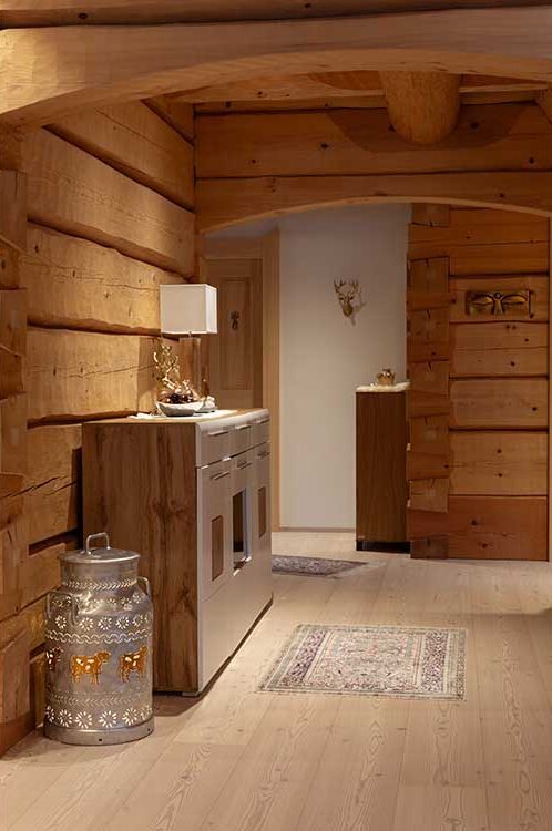 L’artigianato tradizionale è evidente non solo nella costruzione stessa, ma anche nelle superfici in legno: «Sono tutte lavorate a mano!» spiega Michael Koller con orgoglio. E indica l’ascia larga, l’utensile con cui le superfici in legno piane vengono scolpite secondo un antico metodo. Per ogni metro quadrato ci vuole un’ora intera di lavoro. Un lavoro faticoso, come centinaia di anni fa. Per proteggerlo dall’umidità, e quindi dalle macchie grigie di muffa dopo il taglio, il legno viene oliato con prodotti totalmente naturali. Anche in questo caso il carpentiere segue un approccio ecologico e sostenibile, che si riflette non da ultimo nell’assenza di qualsiasi spreco di materiale. Ogni tronco viene sfruttato al massimo: i rami vengono utilizzati come elementi verticali delle ringhiere e il legno residuo impiegato per il tavolato del tetto o trasformato in travi squadrate.