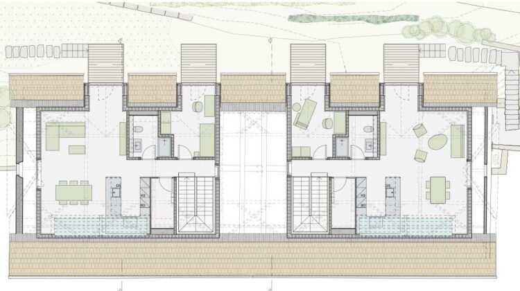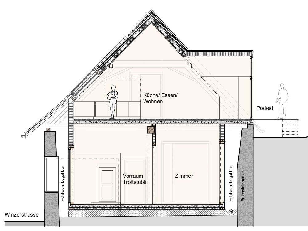 Fino a poco tempo fa, nella Rote Trotte di Wettingen si praticava ancora la pigiatura dell’uva, nello specifico delle uve rosse. Da esse deriva il nome, che significa «torchio rosso». L’ultimo viticoltore si è trasferito tre anni fa, andando ad abitare nello stesso comune in un edificio sostitutivo. Con la continuazione della produzione vinicola nella località si è aperta la strada per una riconversione del vecchio edificio. Bruno Käufeler era cresciuto accanto al locale di pigiatura e ha colto l’occasione per acquistare e risanare l’immobile soggetto a protezione. L’edificio è un lungo rettangolo formato da muri in pietra grezza e da un tetto a capanna con spioventi su entrambi i lati. A 4,50 metri di altezza, trasversalmente al colmo, si trova una possente travatura. La struttura in legno è rimasta invariata, ma le estremità delle travi presentavano gravi danni da marciume. Susanne Vogelsang, amministratrice della Max Vogelsang AG di Wohlen, ha dichiarato che circa la metà di esse ha necessitato di interventi di riparazione. Ciò significa che i carpentieri hanno dovuto incollare e avvitare le travi, spesse circa 22 x 22 centimetri, con giunti a metà legno. La capriata semplice, risalente a diverse centinaia di anni fa, aveva subito danni soprattutto nella parte inferiore. Sul lato in pendenza, il tetto arriva quasi a sfiorare il suolo. In quel punto, i carpentieri hanno rinforzato tutti i travetti della struttura orizzontale con legno nuovo. Susanne Vogelsang, carpentiera e tecnica edile, ha diretto il progetto avvalendosi della grande esperienza dei suoi collaboratori in questo ambito. Insieme al servizio cantonale addetto alla tutela dei monumenti storici, hanno discusso i dettagli e avviato una collaborazione costruttiva. Per la realizzazione architettonica, i collaboratori della Zehnder Bauexperten hanno seguito il principio di «casa nella casa». In questo modo è stato possibile alleggerire l’involucro storico dell’edificio dai requisiti fisici edilizi e realizzare una complesso residenziale moderno.