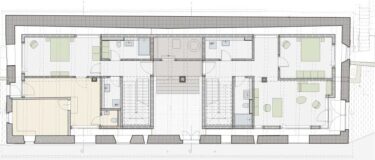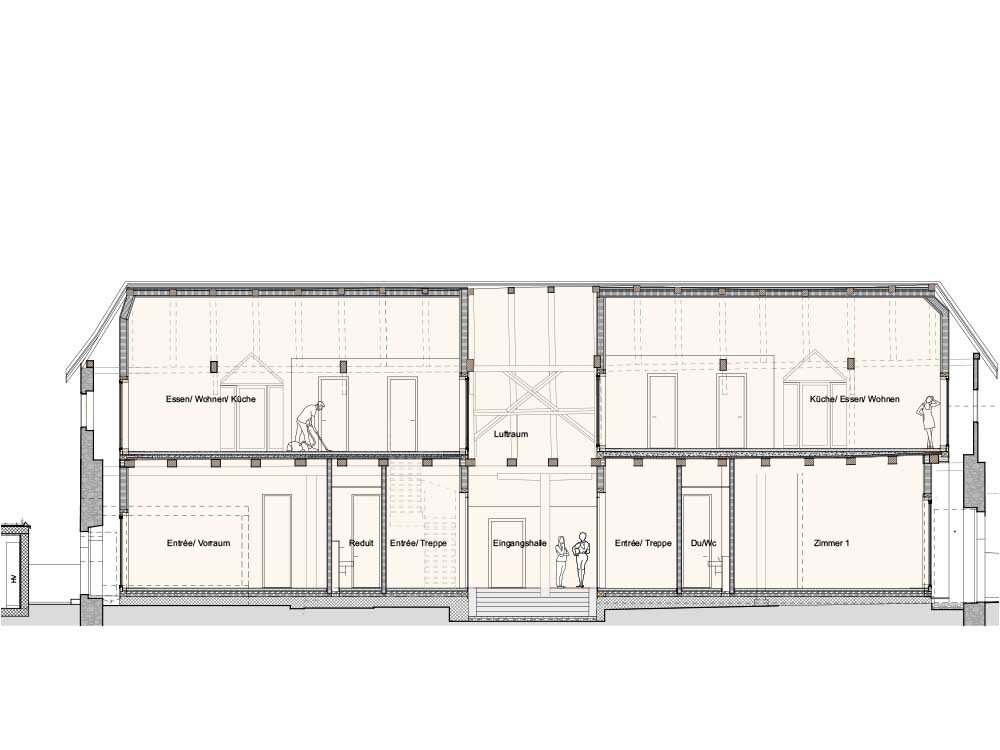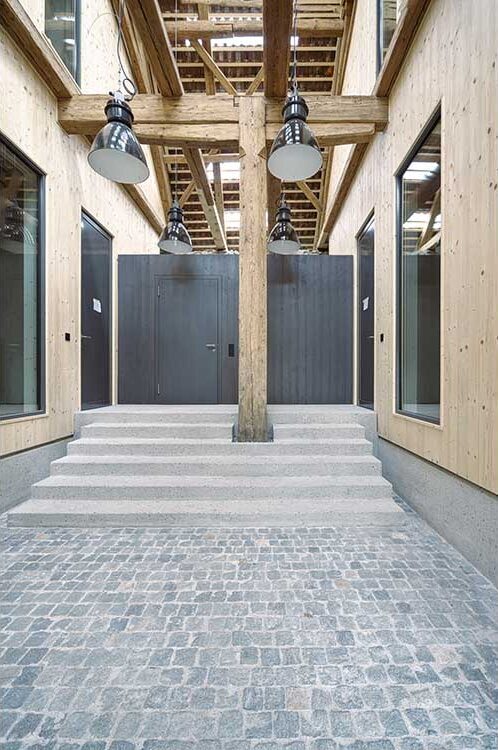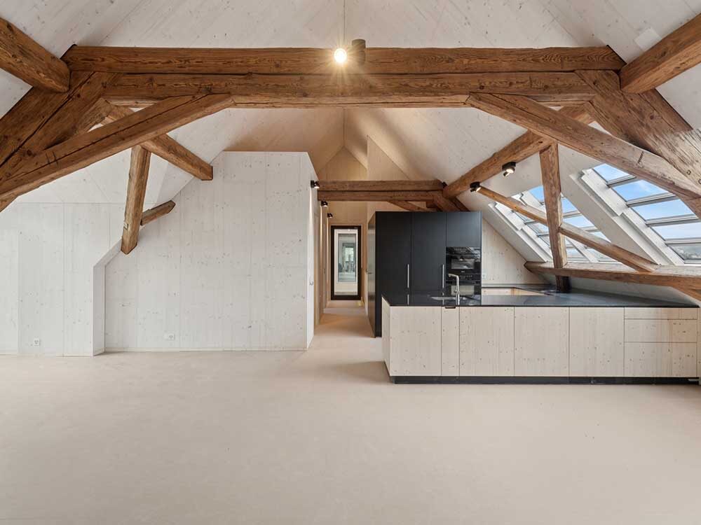 Una nuova piastra di calcestruzzo livella il pavimento, seguita da elementi isolanti, un sottofondo con riscaldamento a pavimento e rivestimento in linoleum. A una distanza di 60 centimetri dalla muratura, i carpentieri hanno inserito nell’edificio non riscaldato una struttura di supporto isolata (spessa 200 mm). All’interno sono stati posati uno strato di installazione e un pannello di abete rosso (30/19 mm), mentre contro la parete esterna è stato aggiunto un semplice cassero in legno (22 mm). Lo spazio intermedio risulta accessibile e l’illuminazione suggestiva mette in risalto la muratura ricca di storia. Gli appartamenti sono riscaldati da una pompa di calore a sonda geotermica, che rilascia calore attraverso il riscaldamento a pavimento.L’ingresso agli appartamenti si trova al centro della facciata longitudinale. Per quanto possibile, le pareti esterne non dovevano essere modificate, tuttavia la sovrintendenza ai monumenti ha permesso l’apertura di finestre nelle pareti e nel tetto. Un’anticamera non riscaldata, che lascia entrare la luce attraverso mattoni di vetro, conduce a due unità abitative: un appartamento di 3½ locali e uno di 4½ locali. Attraverso una scala interna i locatari accedono alla mansarda, dove sono visibili le travi strutturali. Tra di esse, pannelli a tre strati e un isolamento nella zona delle travi completano il tetto. Anche il sottotetto, la controlistellatura e la copertura sono stati rinnovati. Il copritetto ha selezionato le numerose tegole piane danneggiate, completando la copertura con le tegole intatte. I lavori di costruzione in legno sono durati circa 14 mesi, durante i quali hanno operato senza sosta da due a quattro carpentieri.