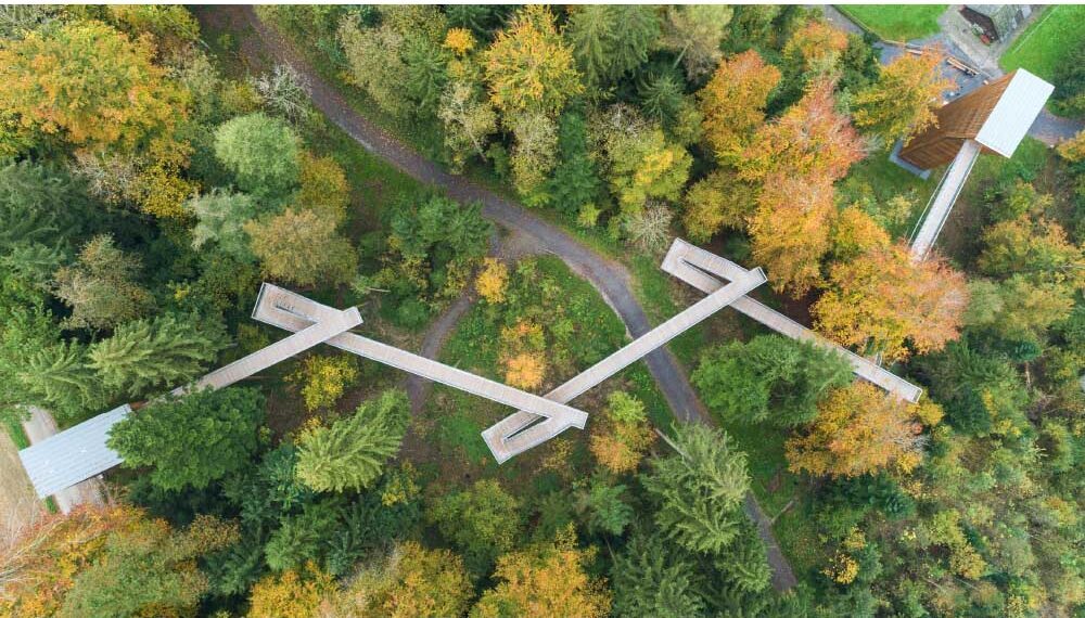 Nei pressi dell’ex filanda ai margini del bosco di Baar (ZG) un nuovo percorso conduce dalla «Buebegunte» alla piattaforma panoramica «Vogelwinkel». Il camminamento è una spettacolare struttura in legno di Abt Holzbau AG, progettata dallo studio 2Eck Architekten. Il dislivello si supera percorrendo quattro spigolosi tornanti e 265 scalini che fanno battere forte il cuore dei visitatori. Testo Sue Lüthi Immagini Abt Holzbau AG, Korporation Baar-Dorf, Regine Gieseke progetti 2Eck Architekten, Abt Holzbau AG, Pirmin Jung Schweiz AG