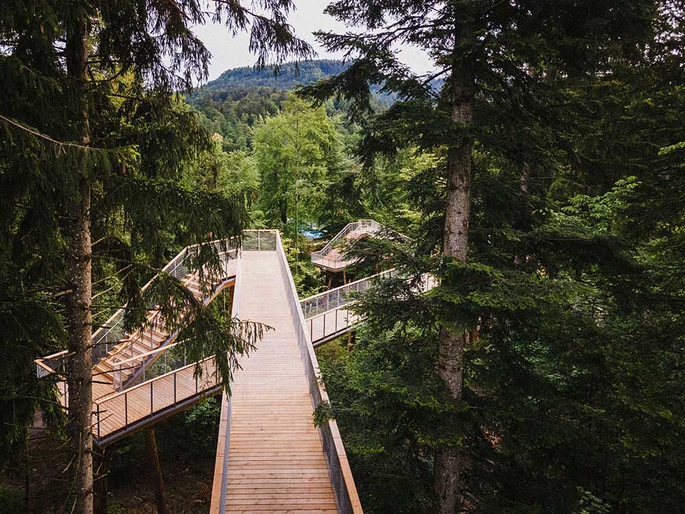 Cyrill Schmid e il suo team hanno tagliato su misura i pali nello stabilimento di produzione, preassemblandoli con l’angolazione desiderata per formare delle coppie di montanti. Abt Holzbau utilizza anche la tecnologia IA di incon.ai, che visualizza un rendering tridimensionale della struttura sul tablet, mentre un proiettore sul soffitto proietta la planimetria sul tavolo di produzione. Con il tablet è possibile visualizzare e gestire a piacere viste e testi. Come preparazione, i pali di legno tondo sono stati dotati di una base di supporto speciale in modo tale che sul posto dovevano essere solo posizionati con la gru pneumatica sulle aste di ancoraggio precedentemente misurate e spostate e sottoposti alla colata di malta. Anche gli elementi della passerella, dei ponti e delle scale sono stati preparati in azienda, inclusa l’impermeabilizzazione e il premontaggio delle piastre di base e di montaggio per la ringhiera. Nel bosco, poco prima della costruzione, gli installatori hanno solo fissato i montanti dei parapetti dotandoli di una rete di protezione laterale, in modo da garantire la sicurezza necessaria per il lavoro già in fase di posa degli elementi della passerella. Un camion ha portato gli elementi della passerella lunghi 40 metri e larghi 1,80 metri e la gru li ha sollevati sulle coppie di montanti. Lo Schlaufensteg è cresciuto così pezzo dopo pezzo, scendendo dal punto panoramico Vogelwinkel fino alla torre d’accesso. Il rivestimento calpestabile era già stato posato in anticipo come elemento, mentre il corrimano e i parapetti in rete metallica sono stati montati sul posto, ad altezze elevate.