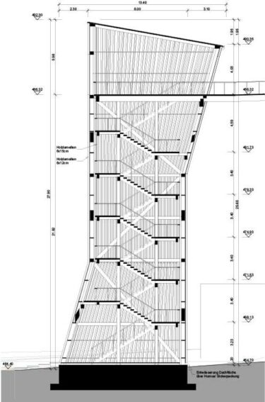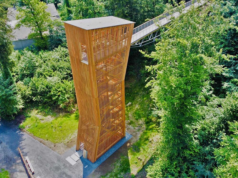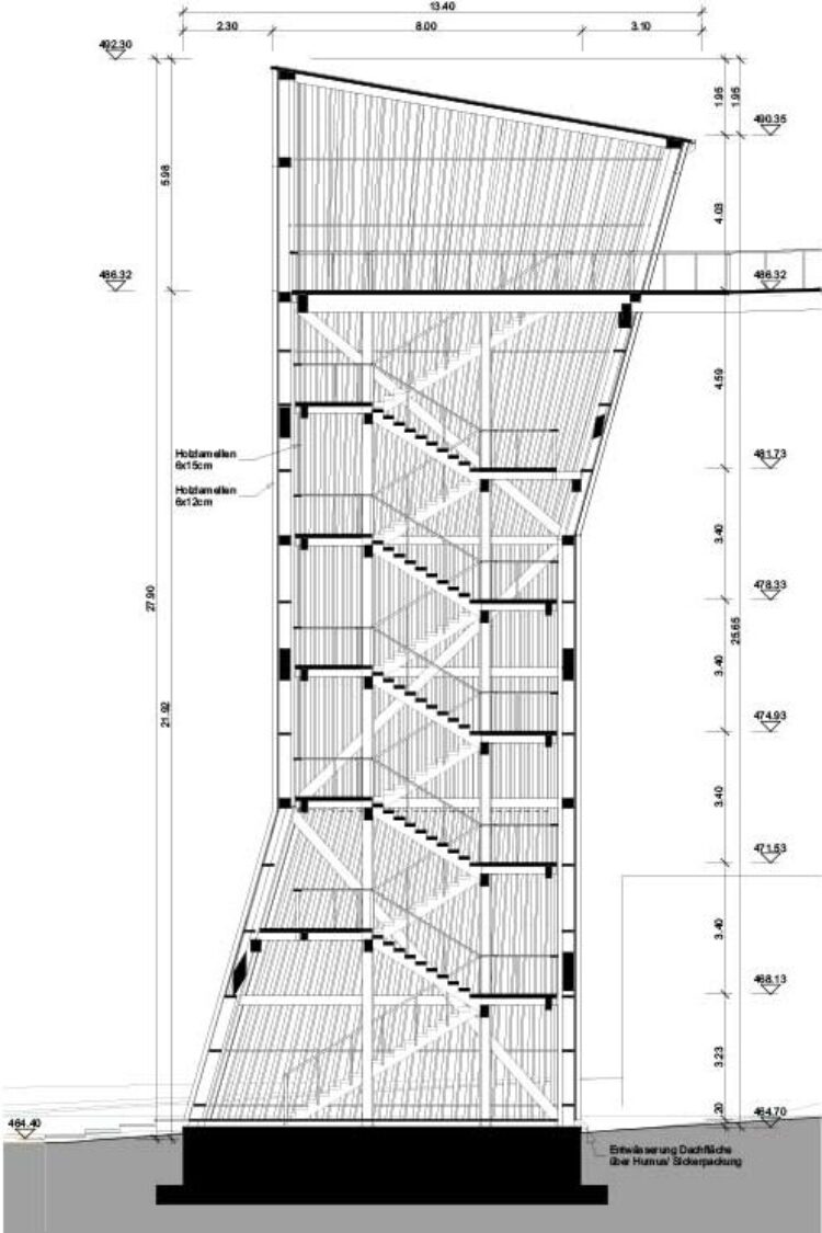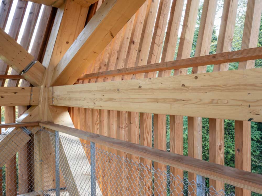 Si inizia con una torre alta 29 metri la cui facciata è piegata su due punti. La struttura è avvolta da lamelle di legno disposte a ventaglio (6 cm × 12 cm / 6 cm × 1 cm) e, a seconda dell’angolo di osservazione, risulta chiusa o aperta e nel complesso molto elegante. Un’apertura invita tutti a entrare e a salire: le scale larghe 1,68 metri conducono verso l’alto mantenendo un’andatura gradevole. Chi vuole prima prendere fiato può ammirare una sorta di gigantesca pista per biglie, che prende forma dietro al primo giro di scale: un omaggio al committente da parte del costruttore. Le scale fanno parte dell’idea di fondo del progetto. I visitatori devono respirare più velocemente e allenarsi visitando la struttura. A un’altezza di 22 metri accedono a un ponte supportato da cui la vista verso il basso è davvero mozzafiato. I visitatori continuano a camminare all’altezza delle cime degli alberi, attraversano la passerella fino a raggiungere nuovi gradini e pedane che cambiano bruscamente direzione e consentono di ammirare il panorama a 360°. Dopo quattro di questi bruschi tornanti, 350 metri di percorso e un dislivello complessivo di 45 metri, raggiungono la piattaforma panoramica Vogelwinkel. Qui la vista si estende sui campi e sulle case, fino alle montagne, passando per il lago di Zugo. Cyrill Schmid è responsabile produzione presso Abt Holzbau AG a Baar. Il progetto era stato predisposto dallo studio di architettura 2Eck Architekten di Baar per un concorso della corporazione Baar-Dorf. La passerella doveva essere per la popolazione di Baar, un sistema per spingere chi visita il bosco a macinare tanti gradini, e anche un modo per pubblicizzare il legno svizzero. Per la realizzazione era richiesta una certa rapidità. Abt Holzbau AG è ricorsa all’aiuto di altre tre imprese di carpenteria, Hürlimann Holzbau AG e Hitz Holzbau AG, nonché Neuen Holzbau AG di Lungern (OW). Affinché potessero far fronte agli agenti atmosferici, per le parti calpestabili e le facciate i carpentieri hanno scelto il legno di abete di Douglas, dotato di una protezione naturale contro le muffe e il marciume e con il vantaggio di una lunga durata e stabilità. I montanti in legno tondo sono tronchi di abete rosso. Questi crescono dritti, sono quasi circolari e hanno pochi rami. In questo modo è stato possibile soddisfare i requisiti statici e geometrici nonché la lunga durata richiesta. I loro diametri sono quasi identici, circa 45 centimetri. I più lunghi dei 61 montanti misurano circa 14 metri.