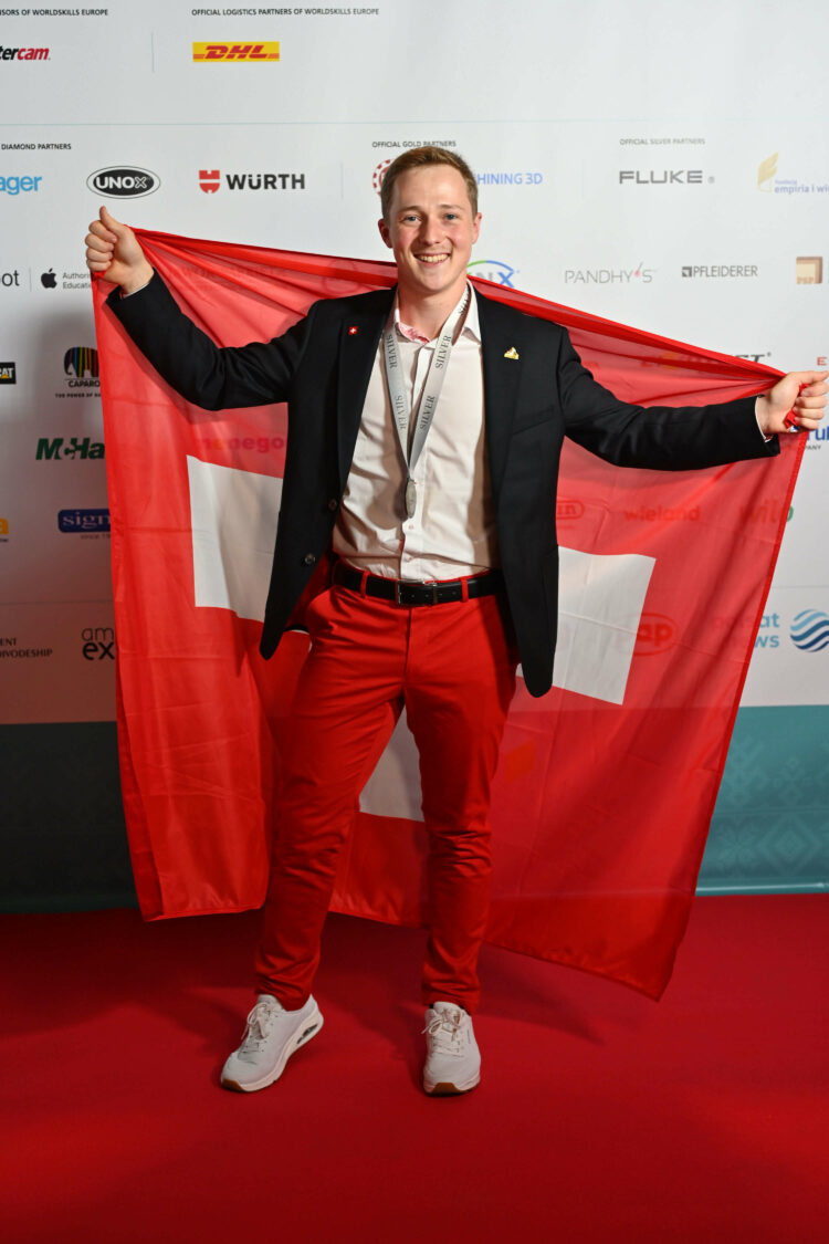 Il verdetto è arrivato solo sabato, al momento della cerimonia di premiazione: con 731 punti il bernese ha vinto la medaglia d’argento agli EuroSkills! È salito sul podio stringendo in mano una grossa bandiera svizzera, sul suo viso si leggevano chiari la gioia e l’orgoglio per una prestazione così eccezionale. Solo il tedesco Jonas Lauthoff ha conquistato due punti in più nella categoria dei carpentieri, aggiudicandosi così la medaglia d’oro. Il bronzo è andato al francese Romain Simon con 724 punti. Questi tre Paesi sono stati anche gli unici a realizzare il modello entro i tempi richiesti.